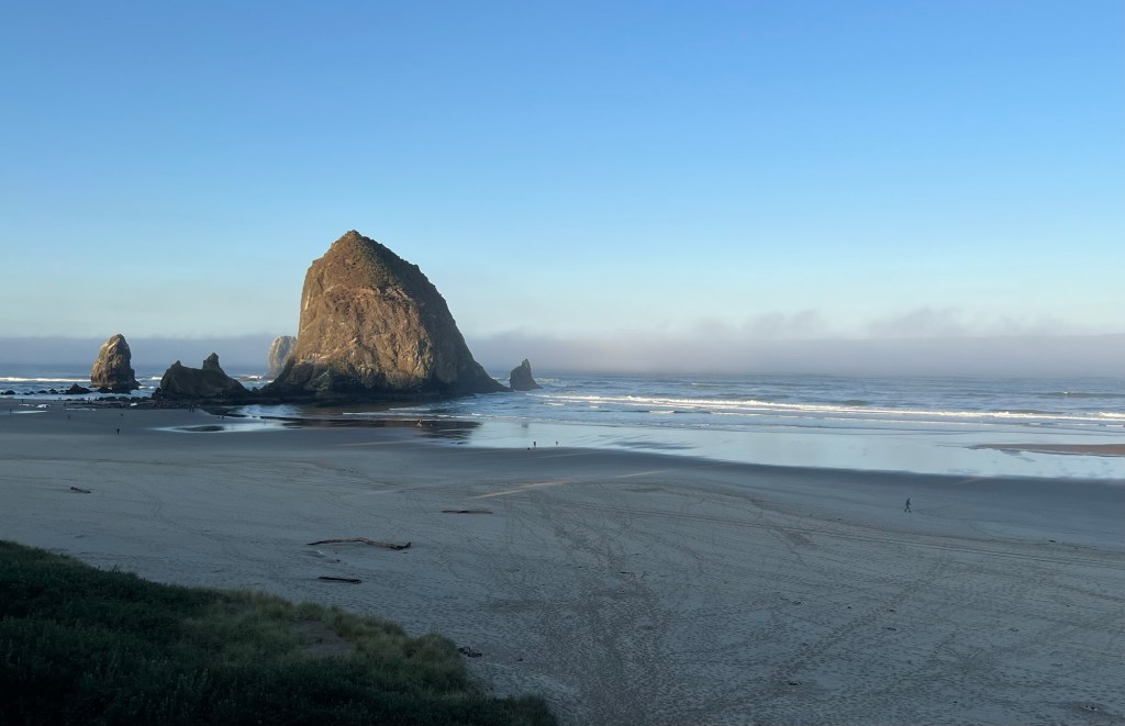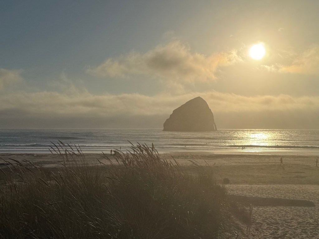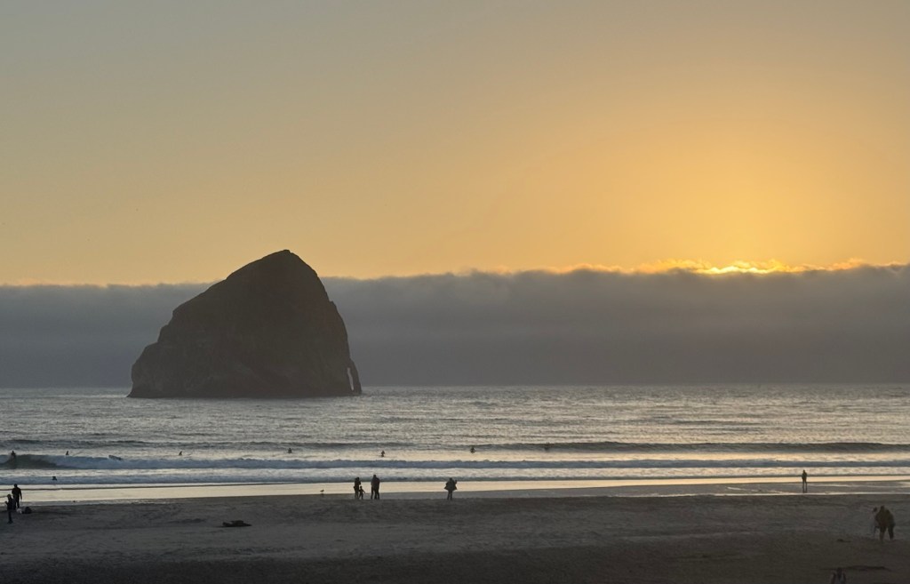 Eventually I was off the detour and headed to my final destination. Pacific City is a small beach town with a great brewpub, Pelican Brewery. Les and I went to dinner there and sat on their deck watching the sunset (although it was more of a fogset, as the sun dipped below the fog). They have their own version of Haystack Rock, with a huge rock offshore which is fascinating as the sun’s rays create new shadows and effects.