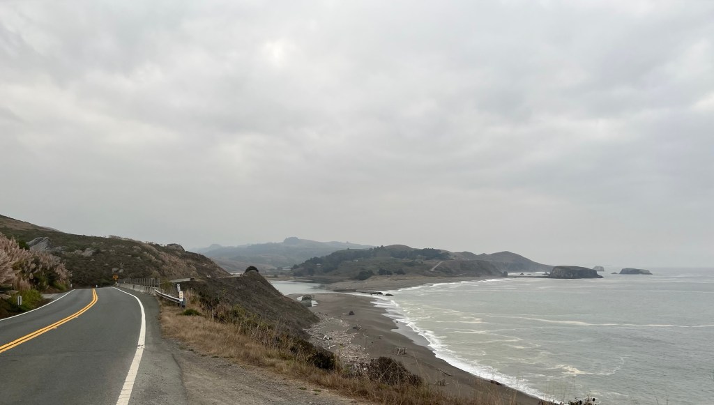 We awoke to grey skies but no rain. The wind was weak, but it was expected to pick up steam later in the afternoon. My first task was to reclaim the territory I gave up yesterday when I passed our hotel and went twelve miles to Jenner. At least I knew what to expect.